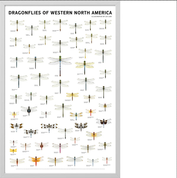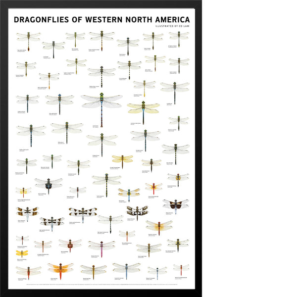 Featuring 59 of the most common dragonfly species found in western North America, this 24 x 36 inch wall poster includes a selection of exquisitely rendered illustrations designed to highlight the intricate details of each species. Reproduced at maximum life size, dragonflies are arranged by types—from darners to clubtails to skimmers, spike tails, and cruisers.